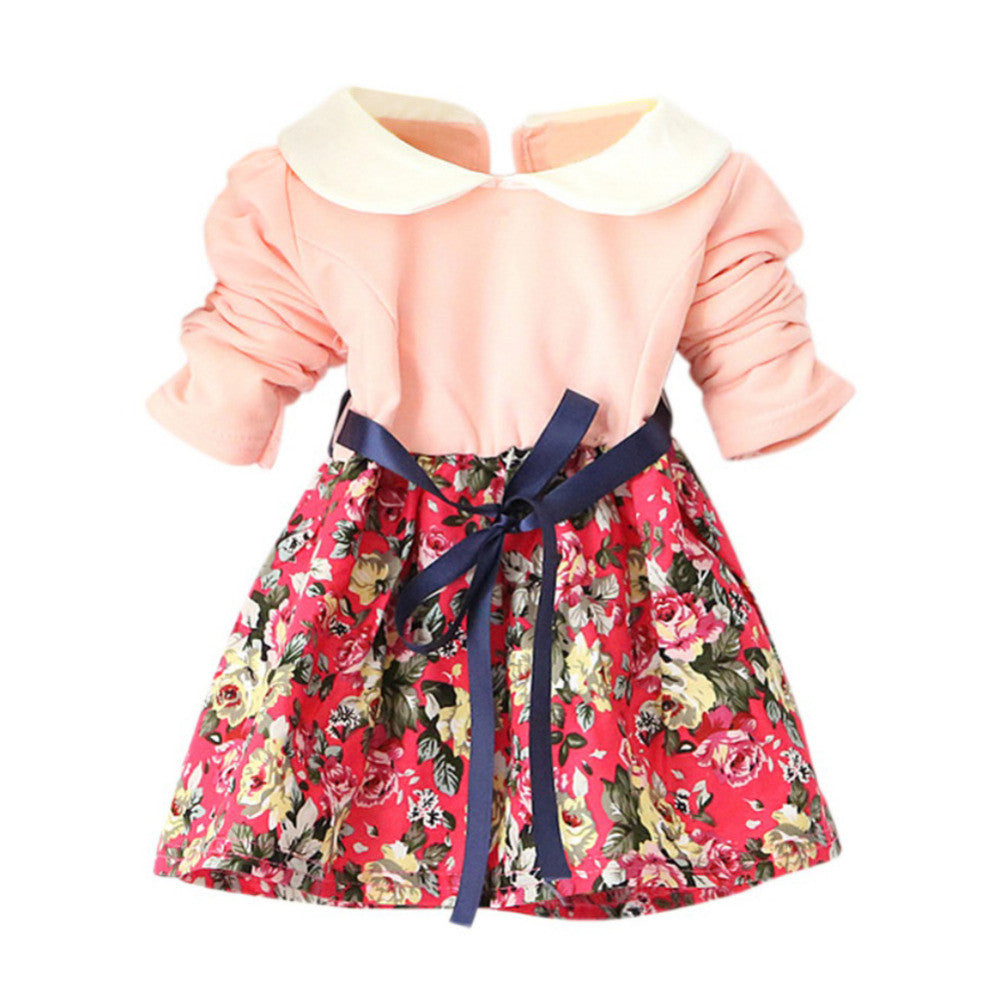 1-5Y Kids Baby Girls Princess Long Sleeve Pleat Floral Bow Mini Dress Party Tutu Dresses J4U66