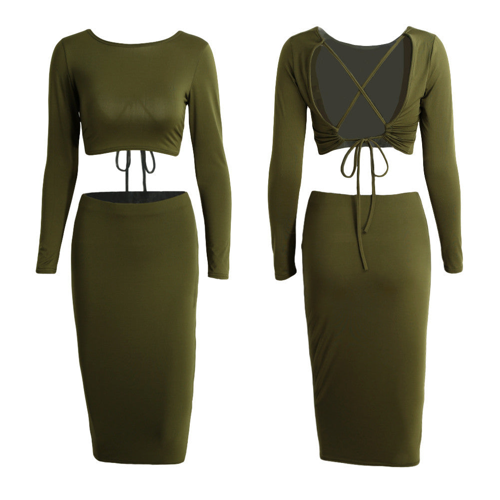 2 piece set women sexy crop top o neck long sleeve backless bandage dress slim fit ladies club midi dresses J4U66