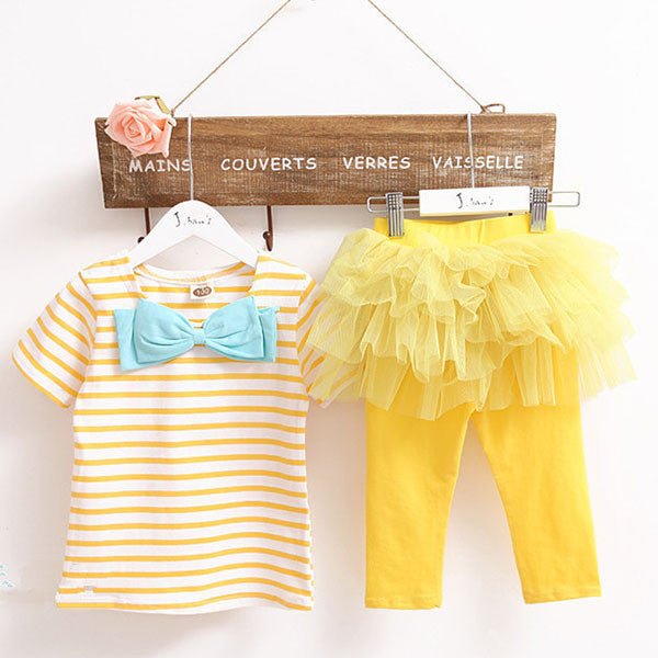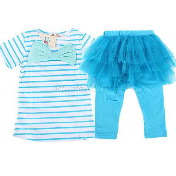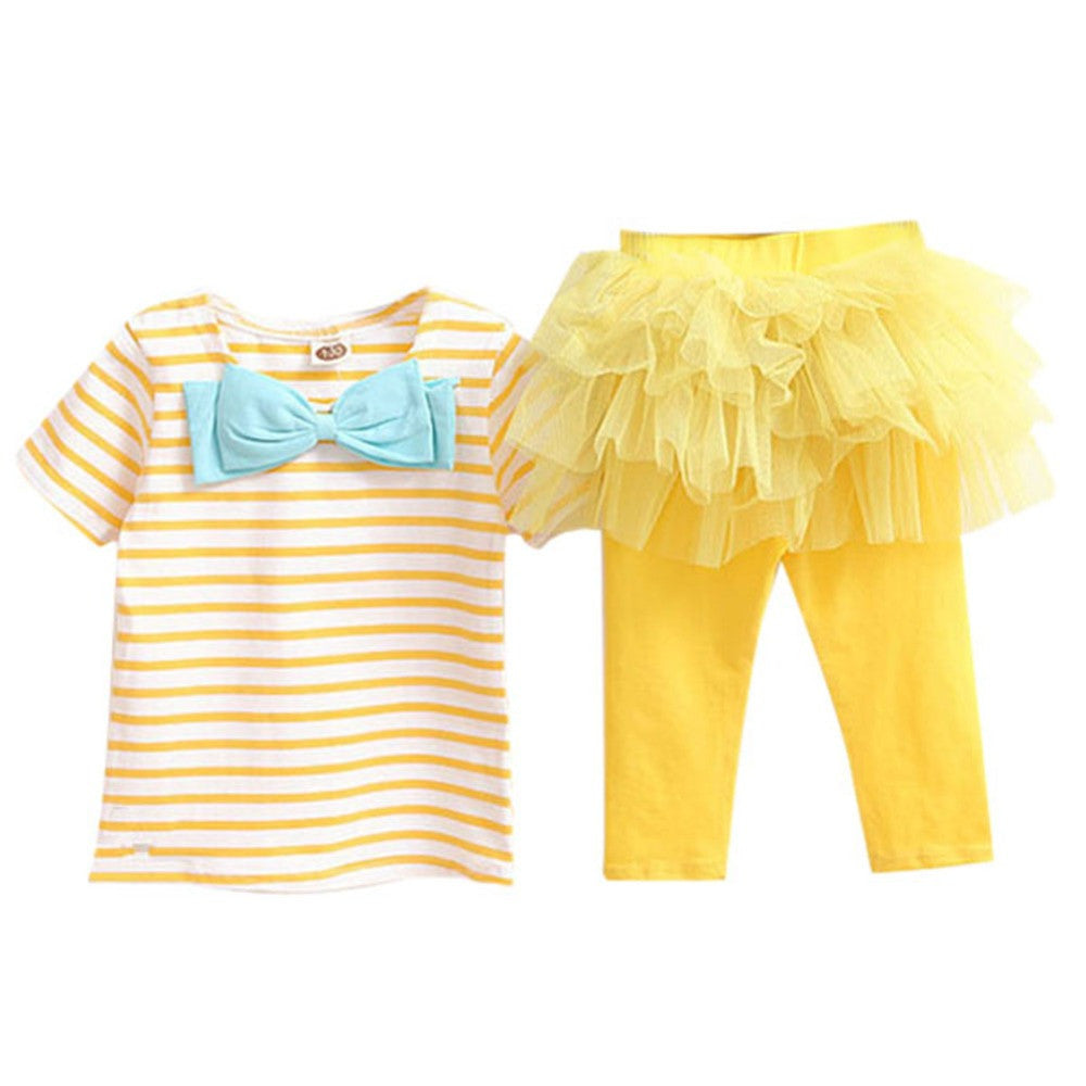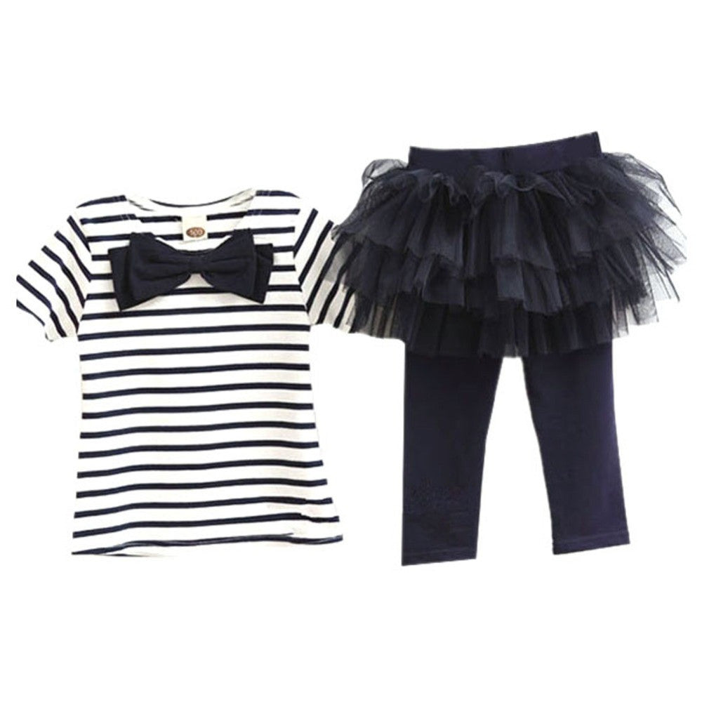 2 Pieces Kid Girls Clothes Set Stripe Bow Top T-shirt + Tutu Skirt Leggings Culottes Outfit Clothing Sets J4U66