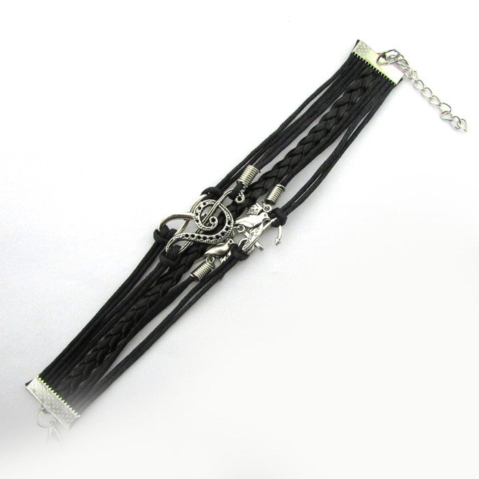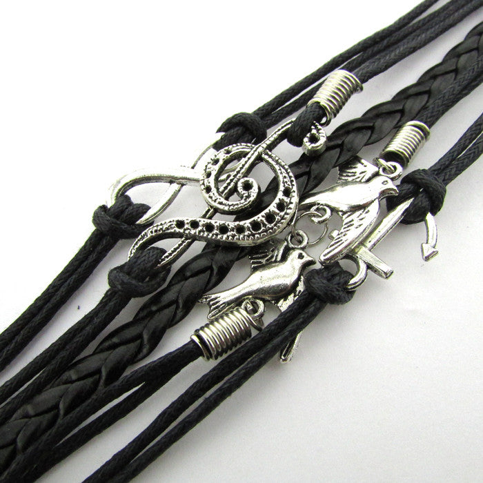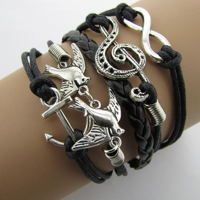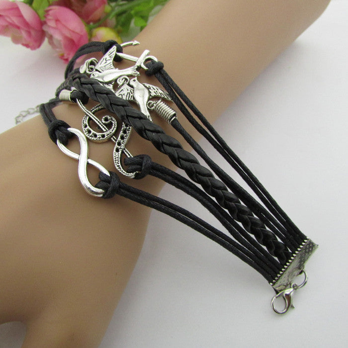 Antique Silver Infinity Double Birds Note Charms Leather Wrap Bracelet ping J4U66