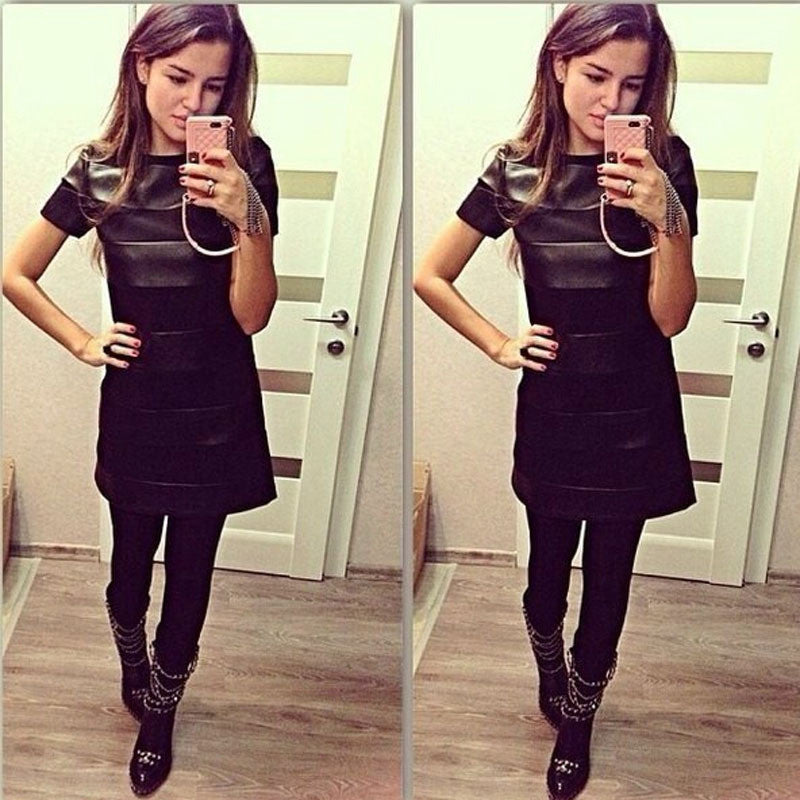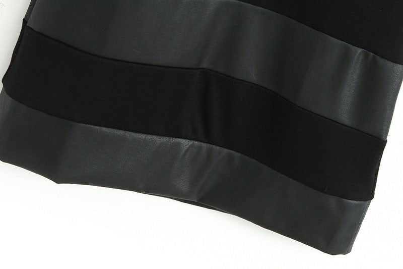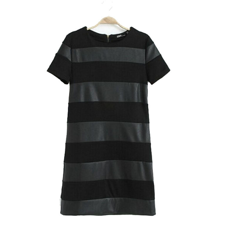 Black Women Slim Short Sleeve Leather Patchwork Casual Sexy Club Wear Bodycon Dress Plus Size J4U66
