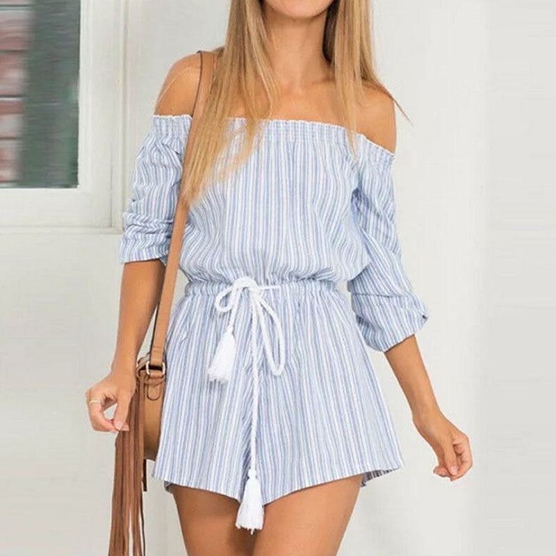 Blue Striped Jumpsuit Women Short Tassel Short Femme Jumpsuits Rompers Womens Jumpsuit J4U66