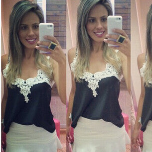 Blusas Femininas Plus Size Patchwork Shirts Women Lace Blouses Sexy Chiffon Blouse Spagetti Strap Vest Crop Tops White Black J4U66
