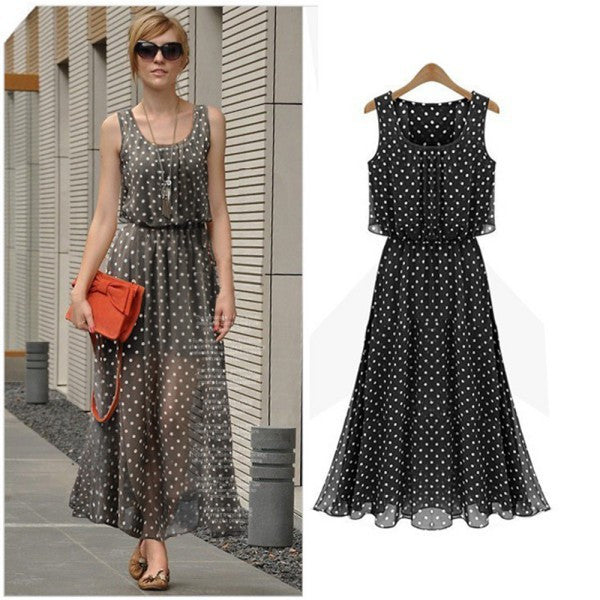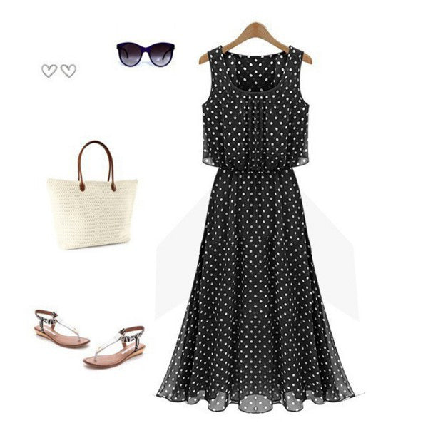 Boho Chiffon Sleeveless Pleated Long Maxi Dress Polka Dot Dresses Sundress J4U66