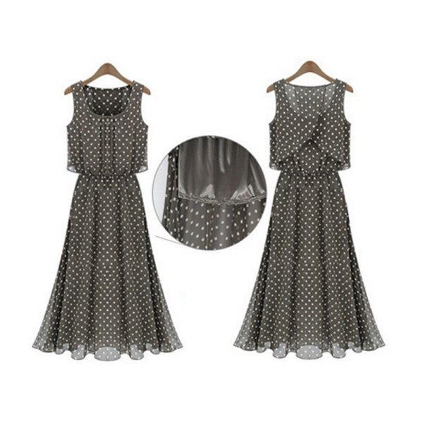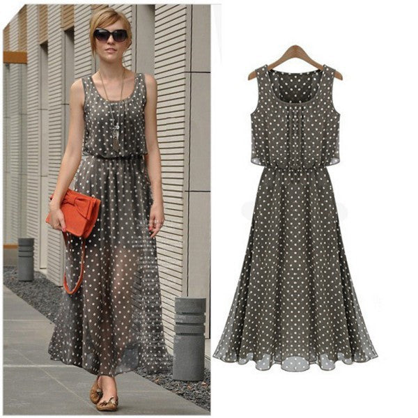boho women chiffon sleeveless pleated long maxi dress polka dot dresses sundress J4U66