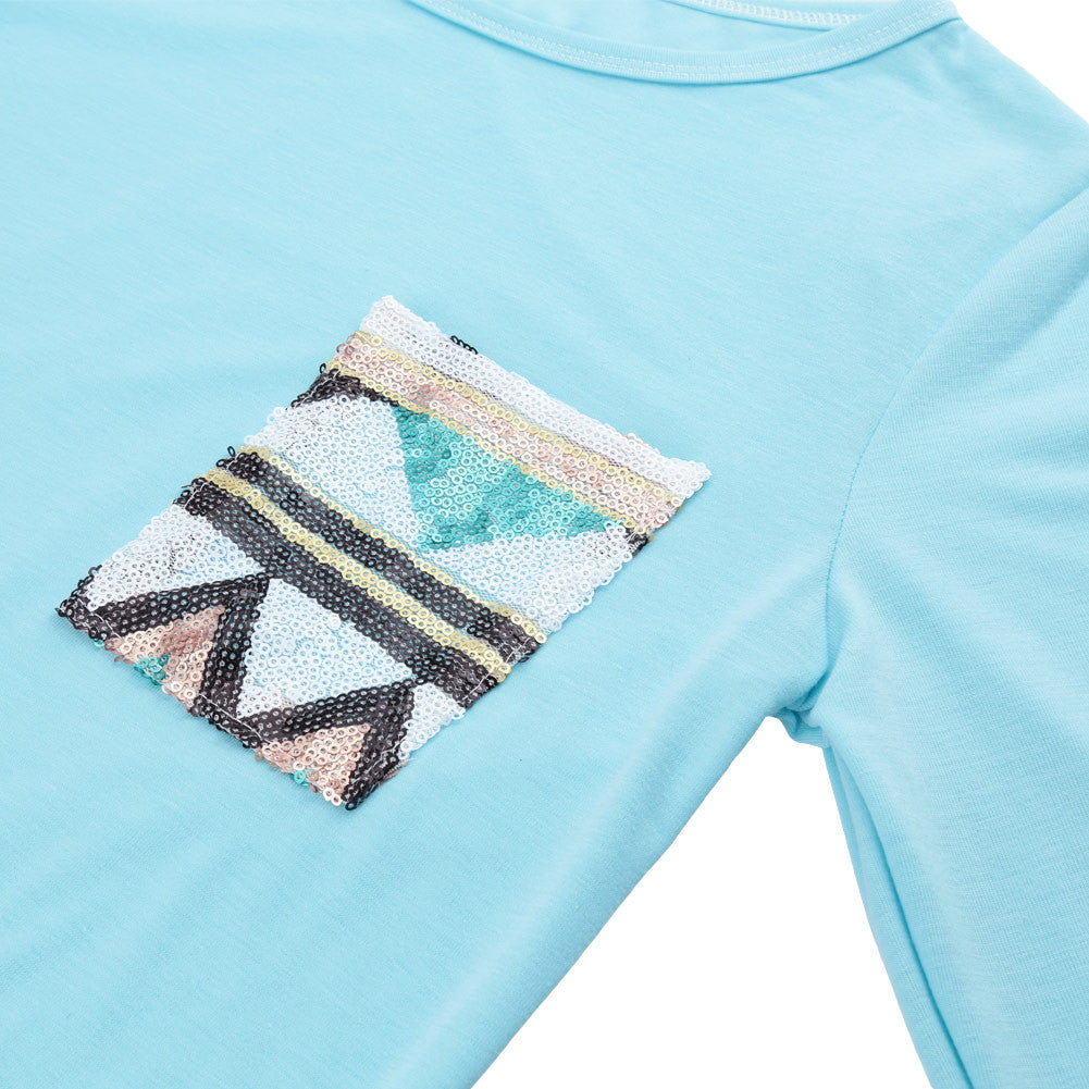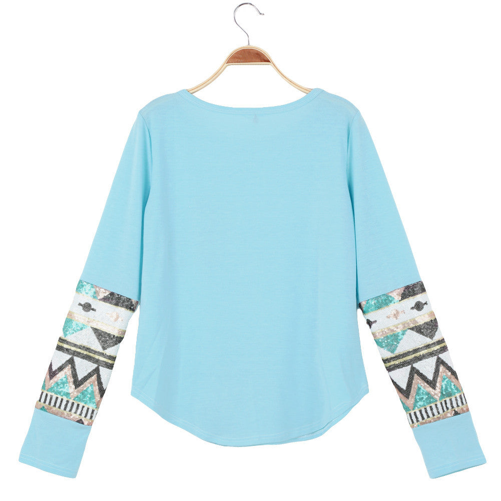 casual t-shirts women geometry print sequin patchwork pocket tee round neck long sleeve women tops plus size J4U66
