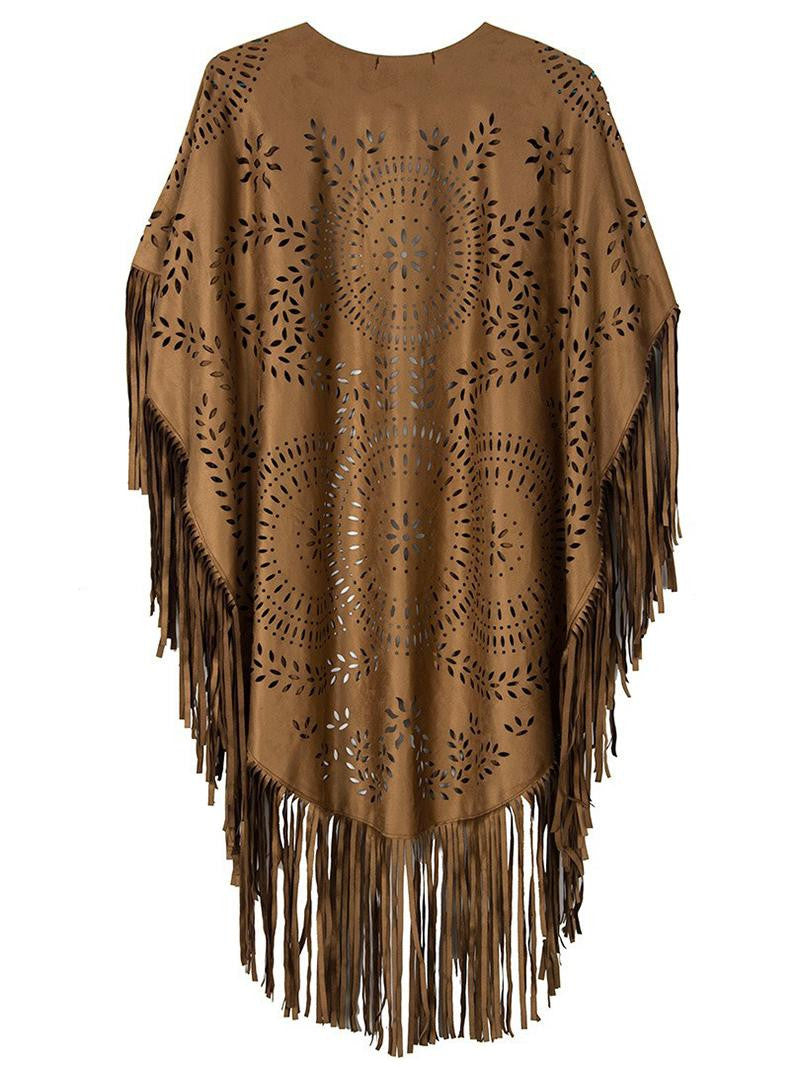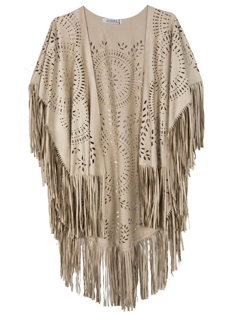 Coat Shawl Beige Cream Floral Cut Out Asymmetric Fringe Tasseled Kimono Cover J4U66
