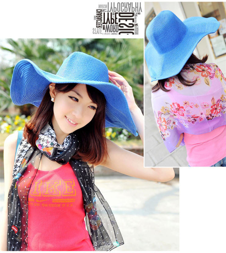cute women straw beach hat wide large brim foldable sun hat royal blue J4U66