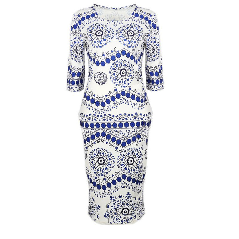 Dress Elegant Floral Print Work Business Casual Party Pencil Dresses Blue And White Porcelain Vestidos J4U66