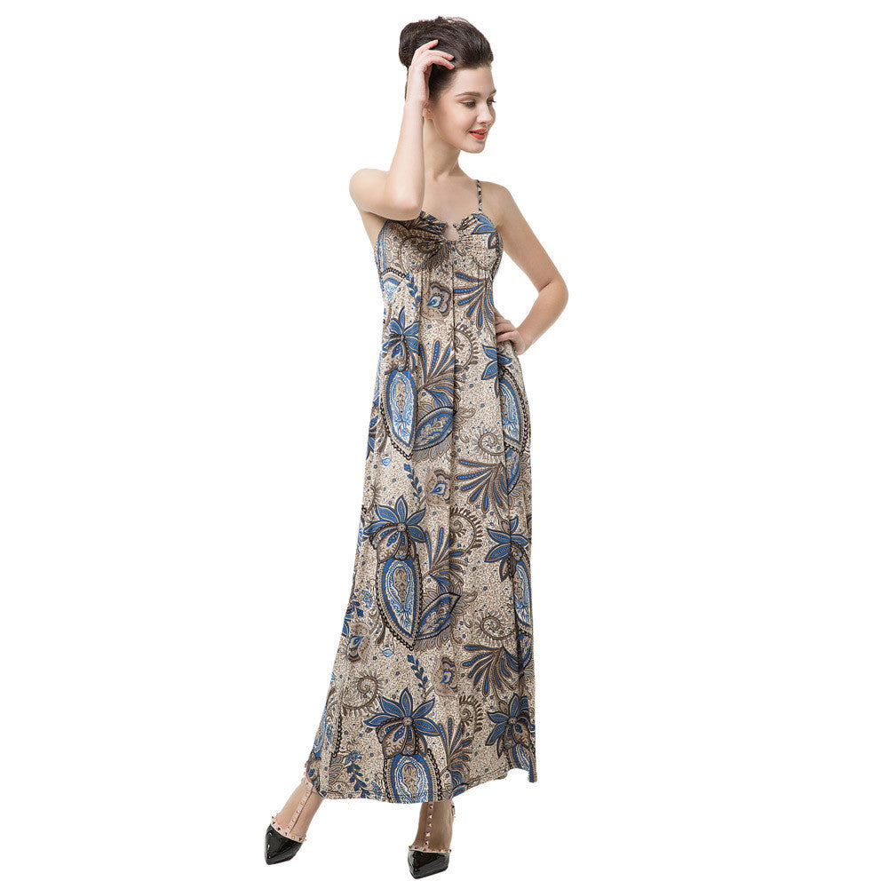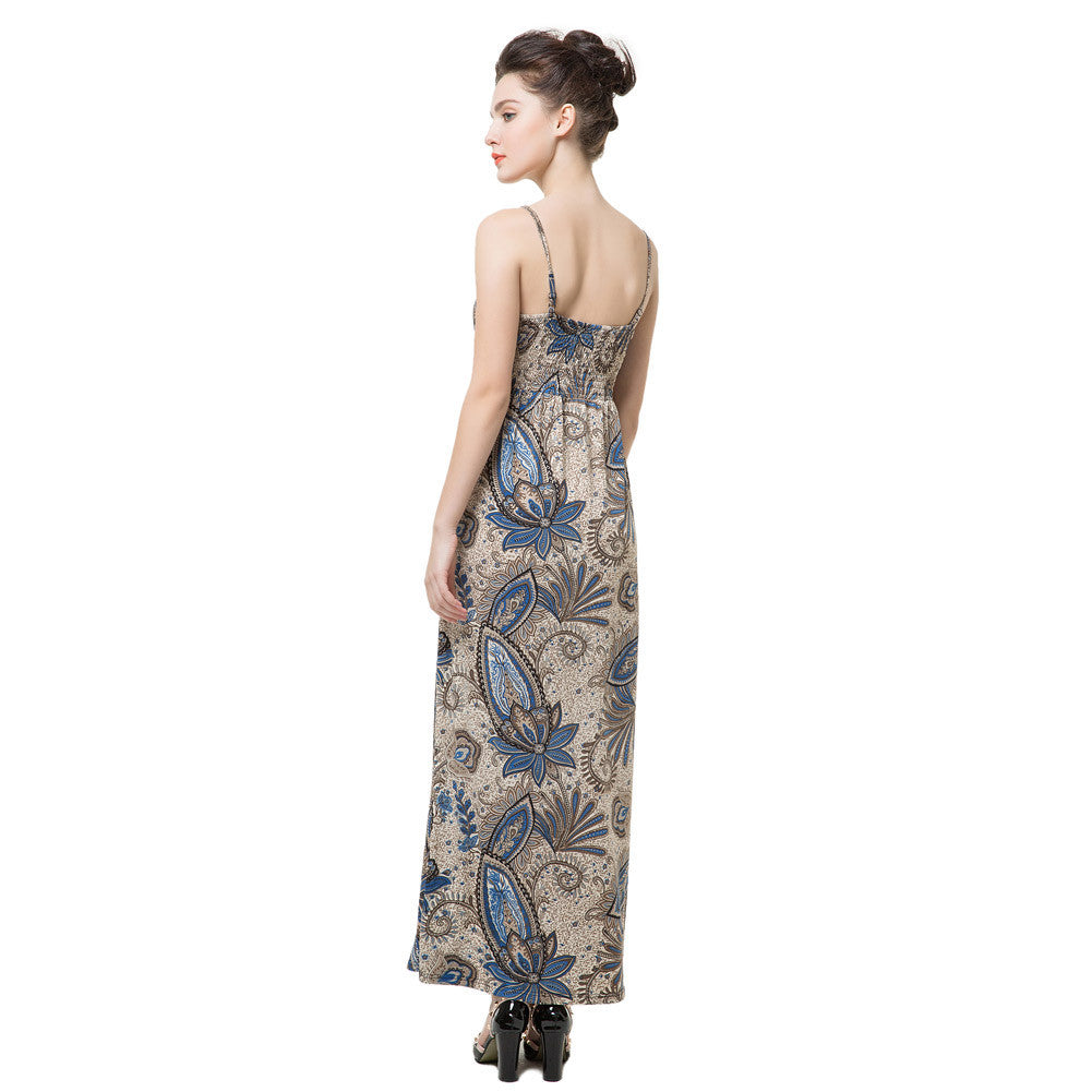 elegance women maxi dress floral print v neck padding women beach dress spaghetti strap long party dress vestidos blue J4U66