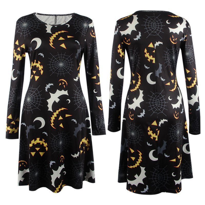 Elegant Bat And Moon Polyester Print Dress With Full Sleeve And O-neck For Halloween J4U66