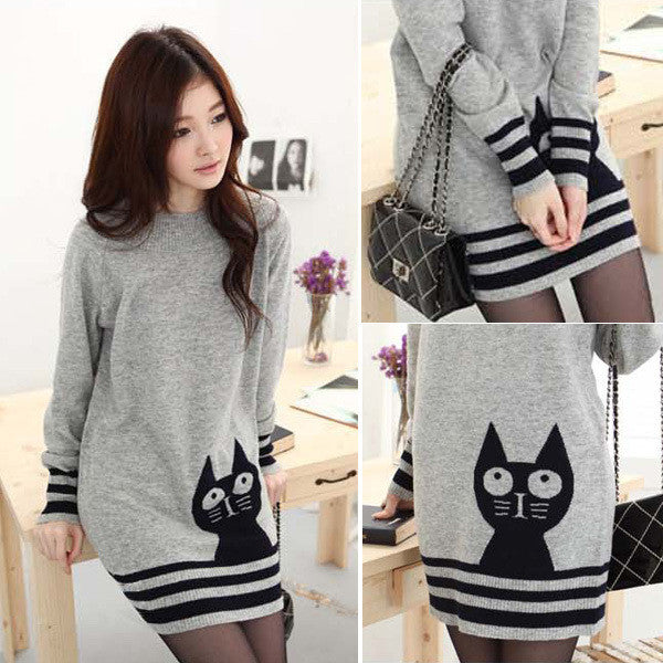 Elegant Long Sleeve Sweater Cute Cat Pattern O Neck Knitted Pullover Tops Knitwear J4U66
