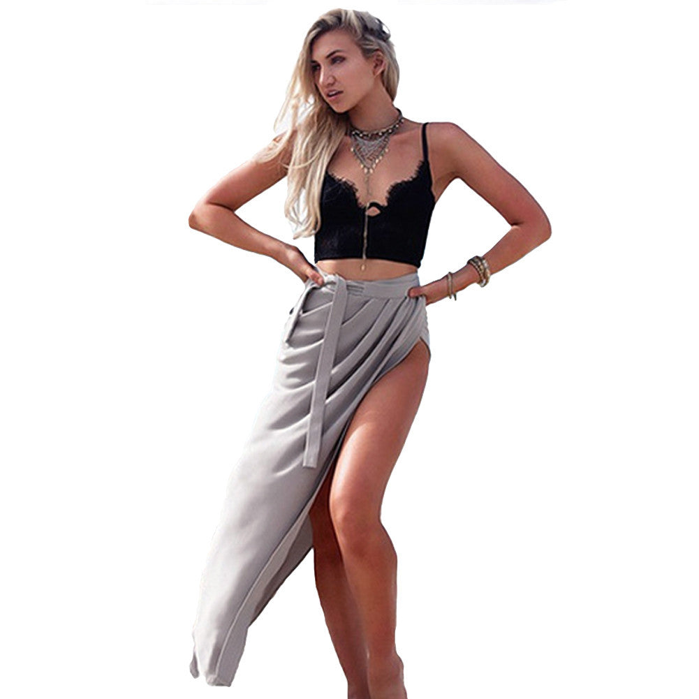 europe sexy skirts womens midi skirt ruched high split belt irregular hem casual beach wear long maxi skirt grey J4U66