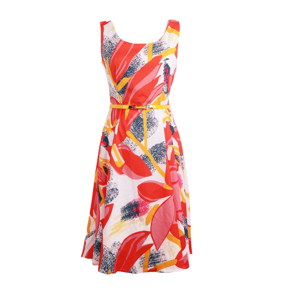 europe women elegant dress floral print dress flower sleeveless o neck slim lady office dress with belt red J4U66