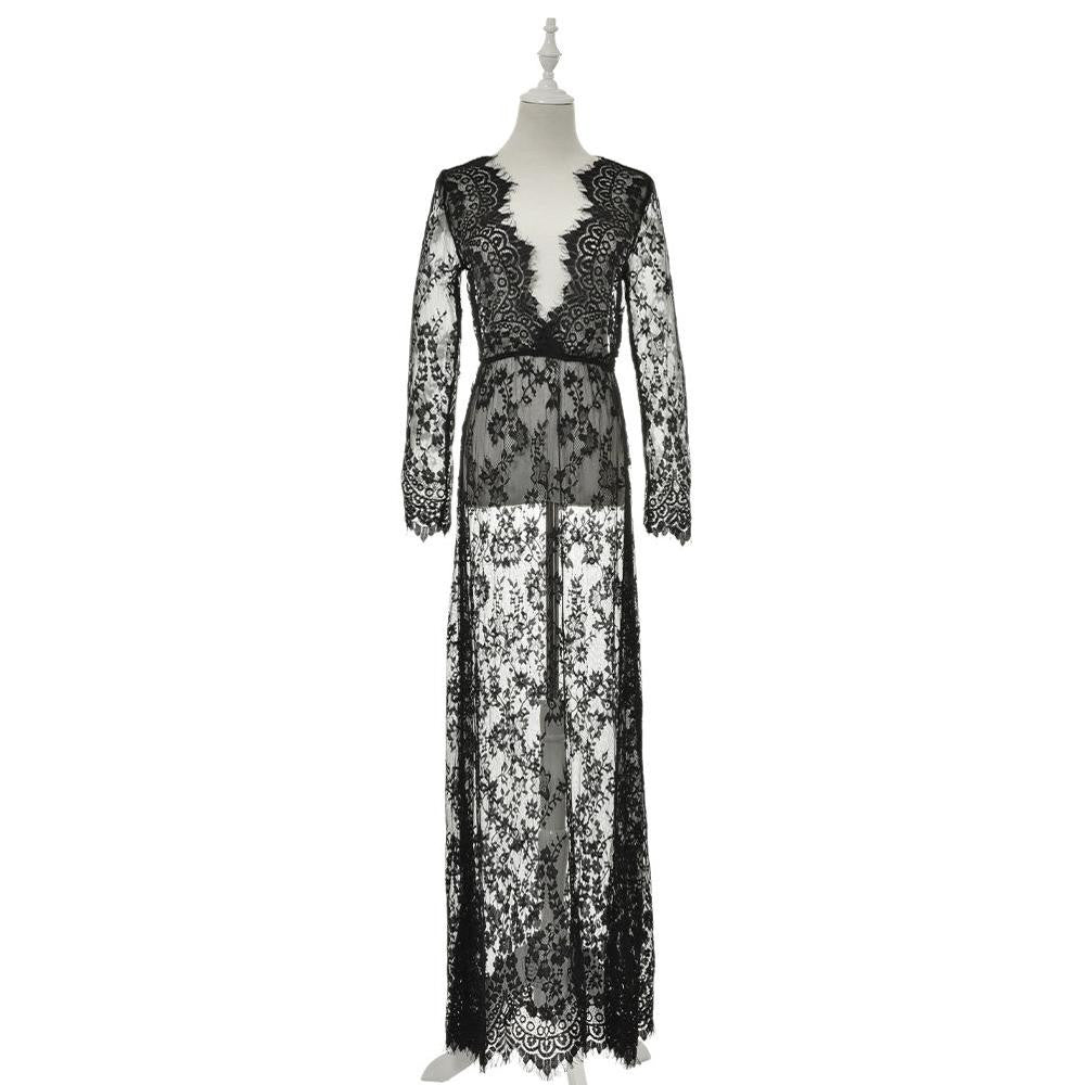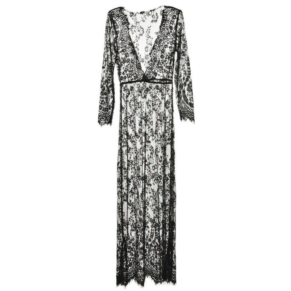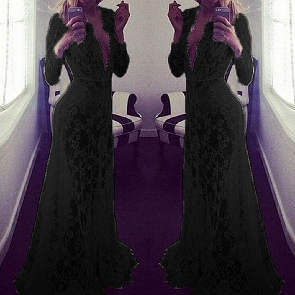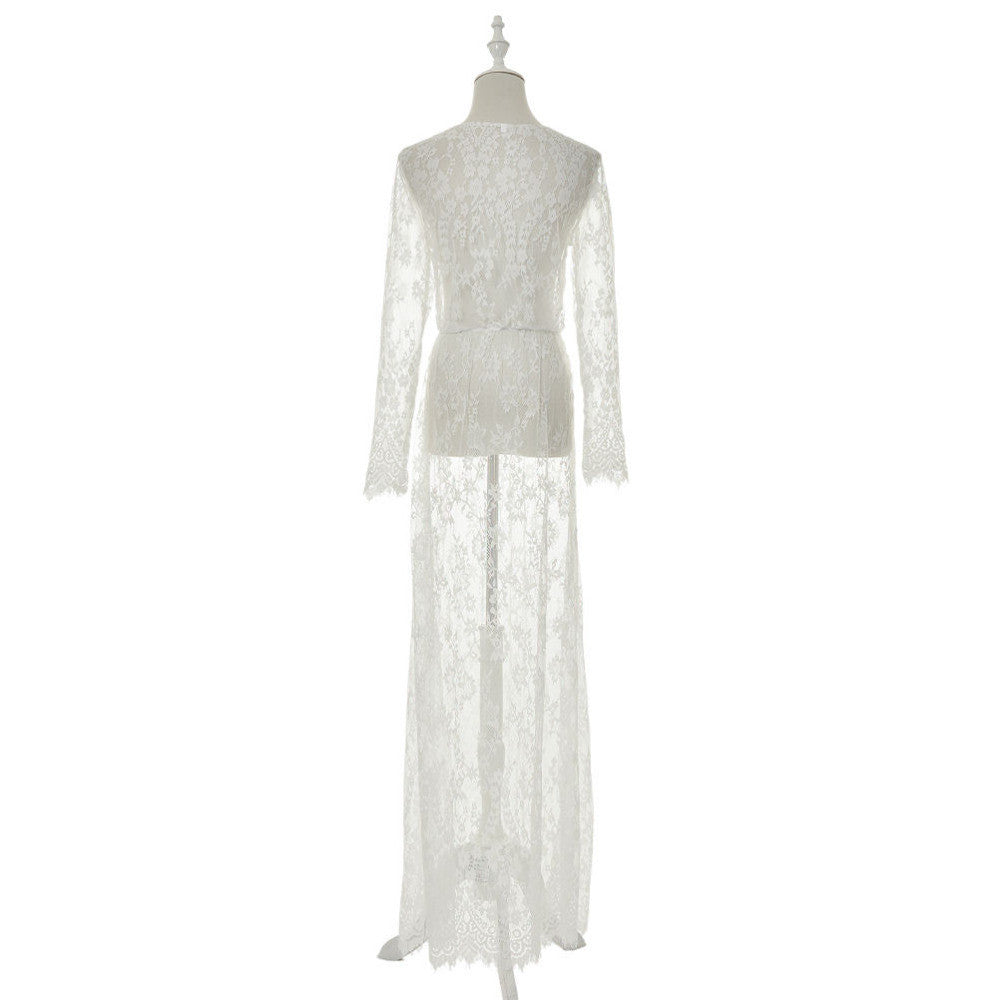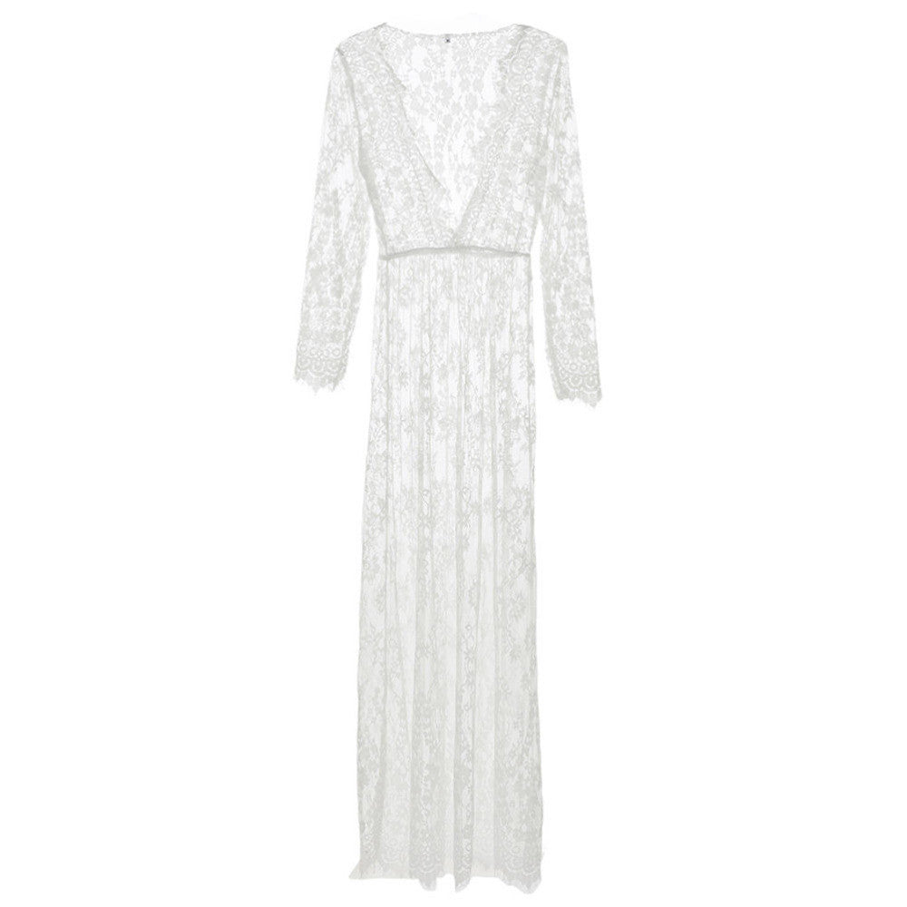 European Style Womens Sexy Lace Embroidery Maxi Solid White Dress Long Sleeve Deep V Neck Vestidos Plus Size M-XL J4U66