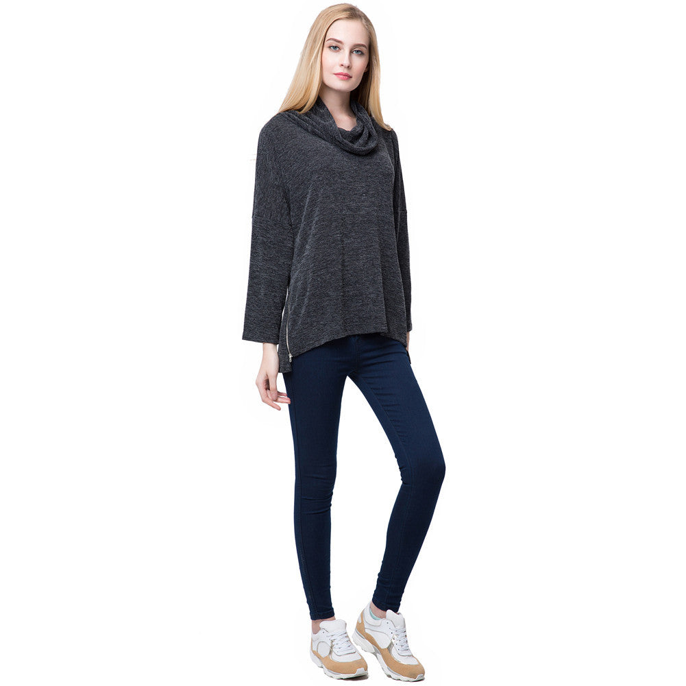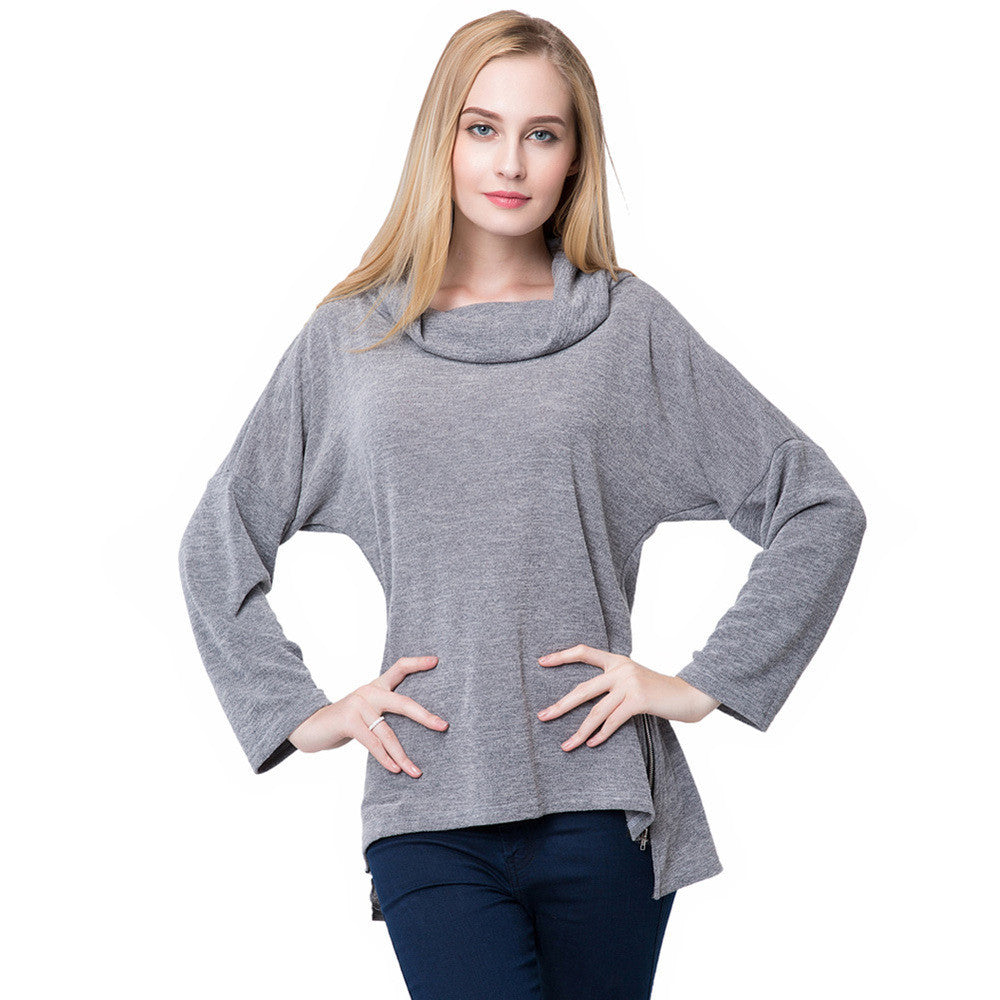 european women casual t-shirts high roll neck side zipper irregular hem t-shirts loose tees women tops knitted pullover J4U66