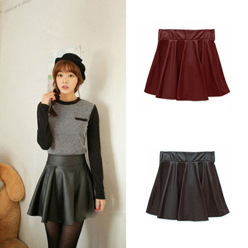 New Women Ladies Faux Leather High Waist Skater Flared Pleated Short Mini Skirt LE2 J4U66