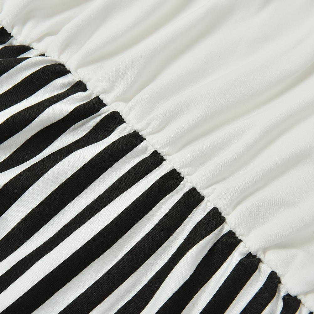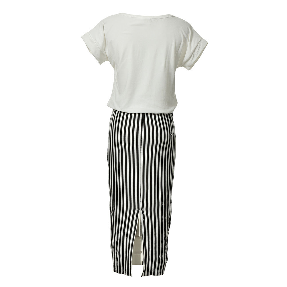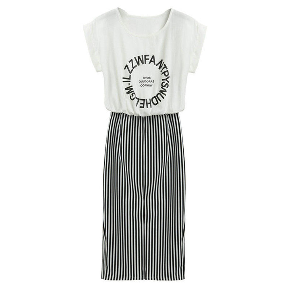 Women 2 in 1 One-piece Letter Print Striped Blouse Dress Midi Long Short Sleeve Bodycon Dress In Stock J4U66